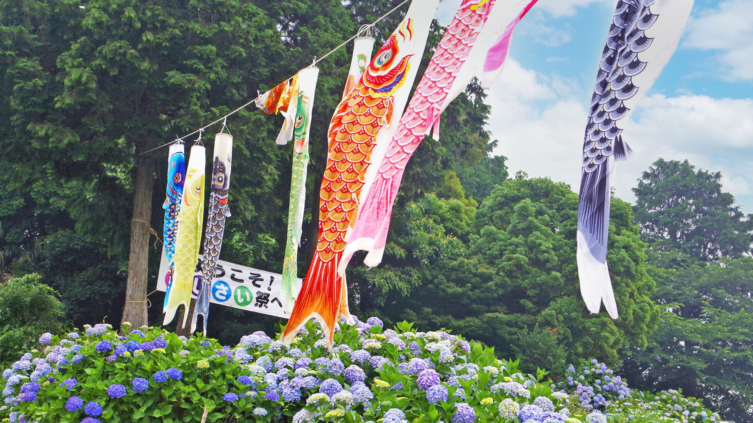 県内の紫陽花の名所として有名な粟井神社の境内や裏山の斜面は、毎年6月、約50種類3000株の青、紫、ピンクなど色とりどりのあじさいで彩られます。このあじさいは、約30年前から地元住民が植栽をはじめ、株を増やしながら世話を続けたものです。1987年から毎年6月の開花時期に合わせ「あじさい祭り」を開催しています。祭りでは神事、神楽が執り行われたあと、バザーや腹踊りなど様々なイベントが行われます。