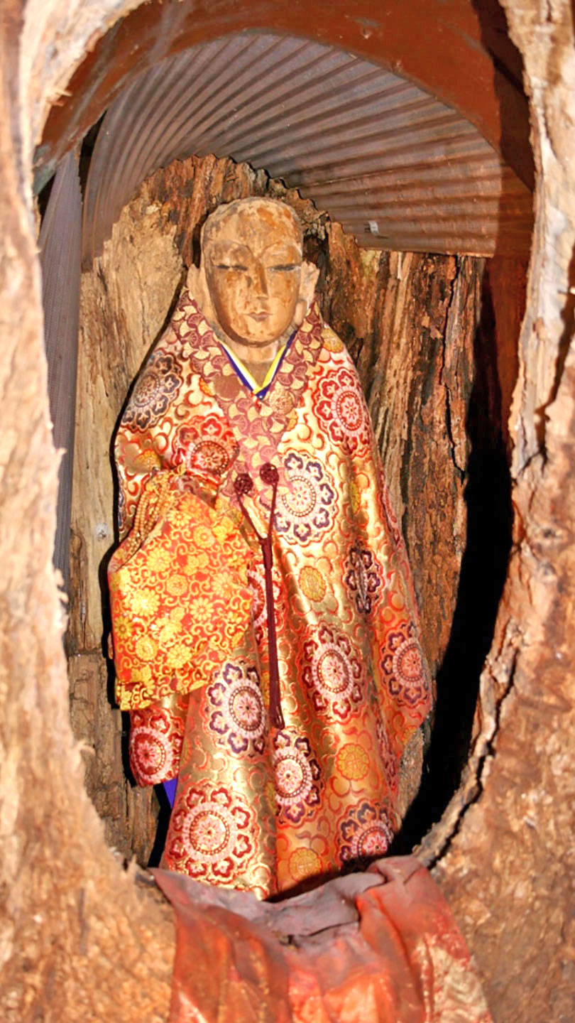 生木地蔵尊(いききじぞうそん)は、樹齢1200年と推定され、胸高周囲10m、樹高30mの大楠。この樹体内に身長150cm(五尺)の地蔵尊があり、近隣の人々から 「生木の地蔵さん」 と呼ばれ崇拝されています。当時の住人森安利左衛門豊秀が、天保7年に一人娘の病弱を案じ掘り上げたもので、「生木の地蔵さん」に願い事をすれば何でもかなうと言われているパワースポットです。最近では、県外からも数多くの参拝者が訪れています。生木地蔵と大楠は、昭和51年6月に指定観音寺市指定文化財(天然記念物)にも指定されています。