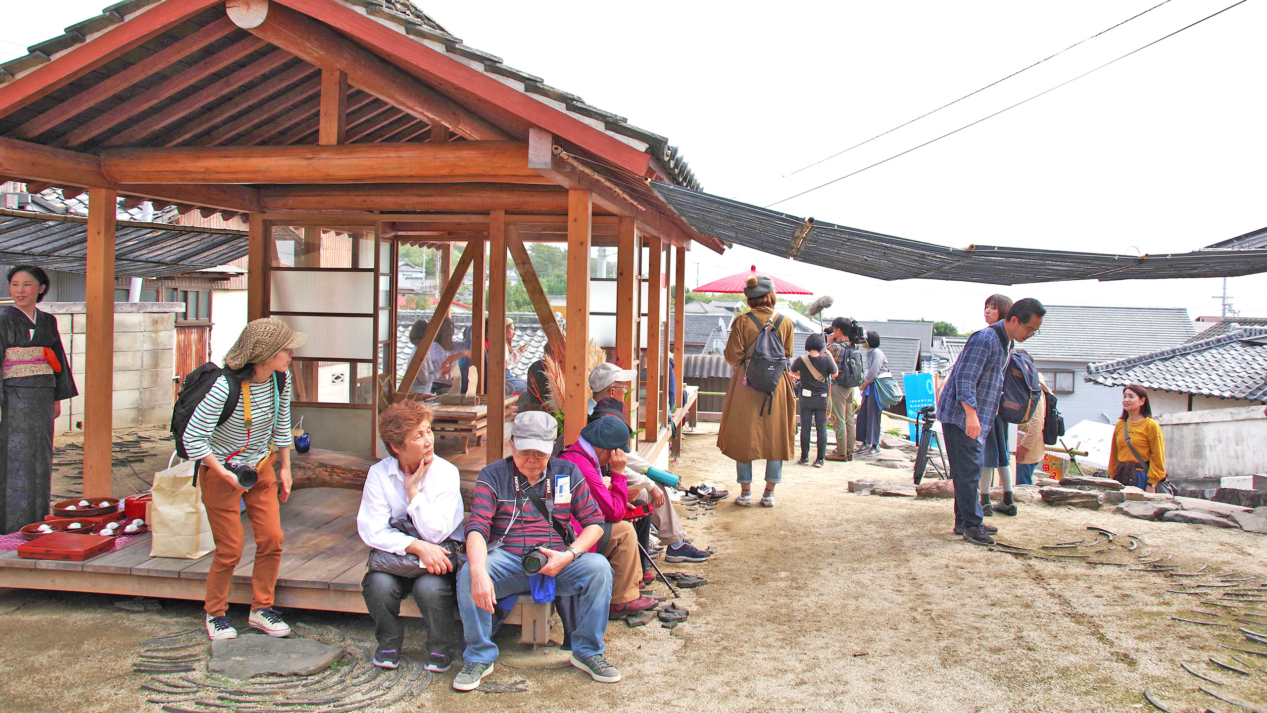 イリコ庵(いりこあん)は、2016年の瀬戸内国際芸術祭で建築家集団「みかんぐみ」と明治大の学生たちが出展した作品です。カタクチイワシ漁で栄える伊吹島のイリコ加工に使うせいろや石垣、木材などを利用して制作したもので、現在も島民から交流の場として親しまれ利用されています。瀬戸内芸術祭の時には、イリコ庵でお茶も振る舞われていました。
