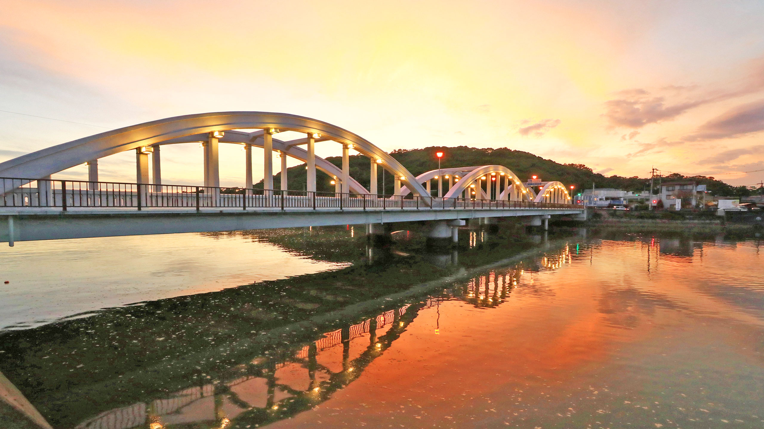 三架橋(さんかばし)は、3つのアーチが美しく「日本百名橋」に選ばれている市内で最も美しい橋です。長さ93m、幅員6mの鉄骨コンクリート下路式タイドアーチ橋で、観音寺市内から有明浜や名勝琴弾公園に行く途中にあります。秋に行われる琴弾八幡宮大祭に9台のちょうさが三架橋を渡っていく様子は観音寺の風物詩であり、特に夜のライトアップの中渡る姿は圧巻です。