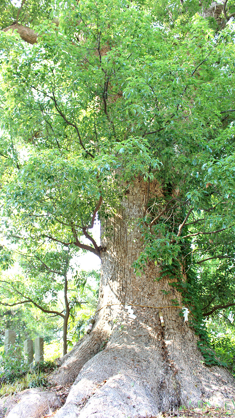 安井菅原(やすいすがわら)神社は、その名の通り菅原道真公を祀ってある神社です。境内の東側、社殿向かって右横に小山のように盛り土された場所に樹齢推定1000年以上と言われている大クスがあります。かつては社殿を被うように大きく繁茂していたそうですが、平成24年8月の落雷による火災で危険になった枝の先端部を切ったため、かなり樹冠が小さくなってしまいました。現在は新芽が成長し、立派な樹姿となっており、大楠の生命力を感じることができます。社殿向かって左側や境内の南東隅にもクスノキの巨樹があり、約30種の樹種が見られる清閑な社叢が保たれています。そのわきには約1,200年前、讃岐の国司だった菅原道真公が腰かけたという「腰かけ石」も残されています。この安井菅原神社のクスは1976年6月10日に観音寺市指定天然記念物に指定されています。