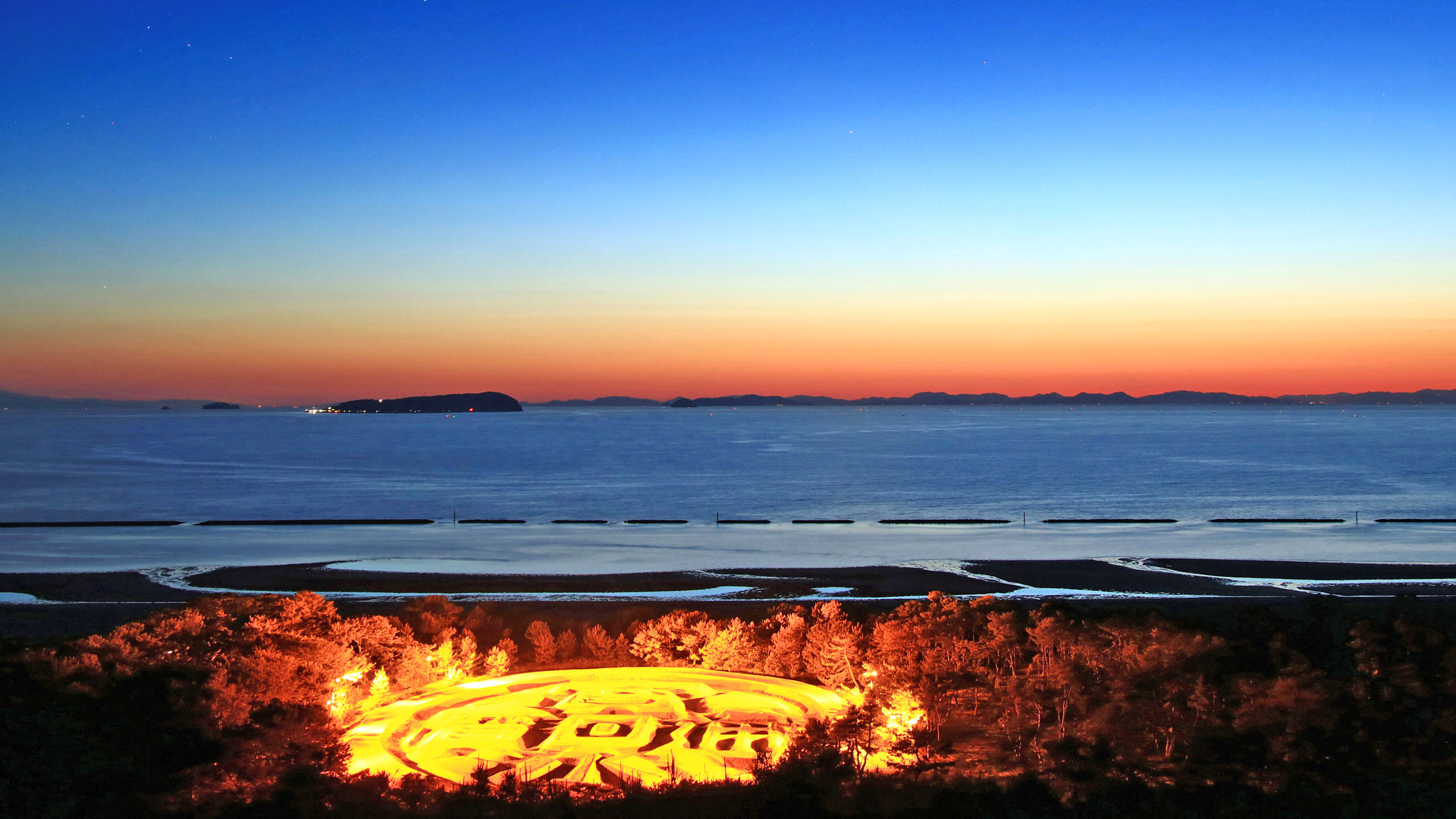 有明浜の砂に描かれた銭形砂絵「寛永通宝」は、東西122m、南北90m、周囲345mもある巨大な砂絵で、琴弾山山頂から見るときれいな円形に見えます。寛永10年(1633)藩主、生駒高俊公を歓迎するために、一夜にして作られたといわれ、他に類を見ないものといえます。この銭形を見たものは健康で長生きができ、お金に不自由しないと伝えられており、近年銭形を見て宝くじを購入した人が高額をあてたことから金運スポットとして知られ多くの観光客が訪れています。テレビ「銭形平治」のタイトルバックにも採用されています。